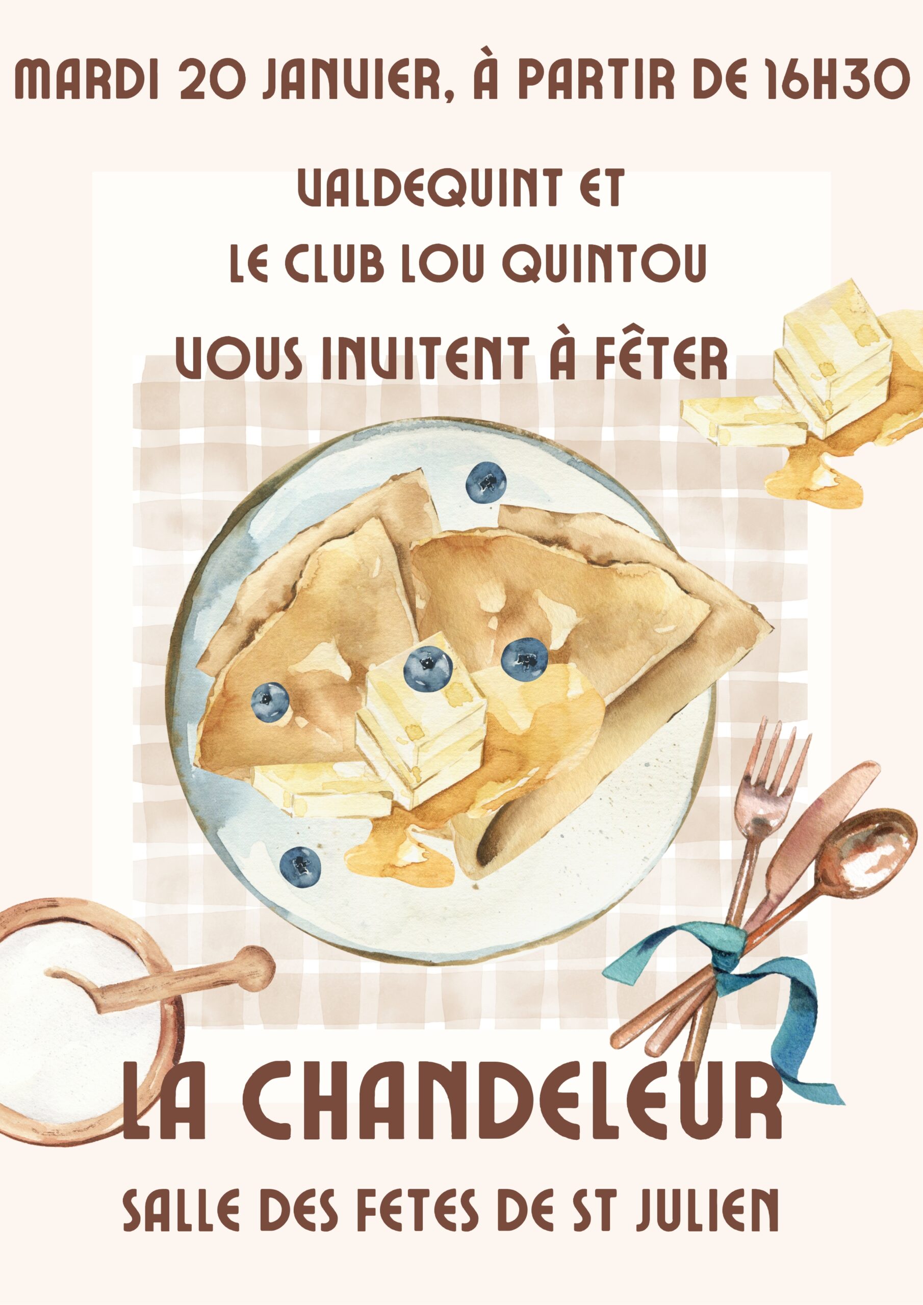 La chandeleur à Saint-Julien Date 20 Jan 2026 Expiré! Heure 16h30 - 18h00 Lieu Saint Julien en Quint Partagez cet événement ↩ retour aux actualités
