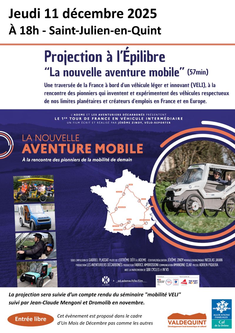 Projection « La nouvelle aventure mobile » Date 11 Déc 2025 Heure 18h00 - 21h00 Lieu Épilibre 35 rue du village, 26150 St Julien en Quint Partagez cet événement ↩ retour aux actualités